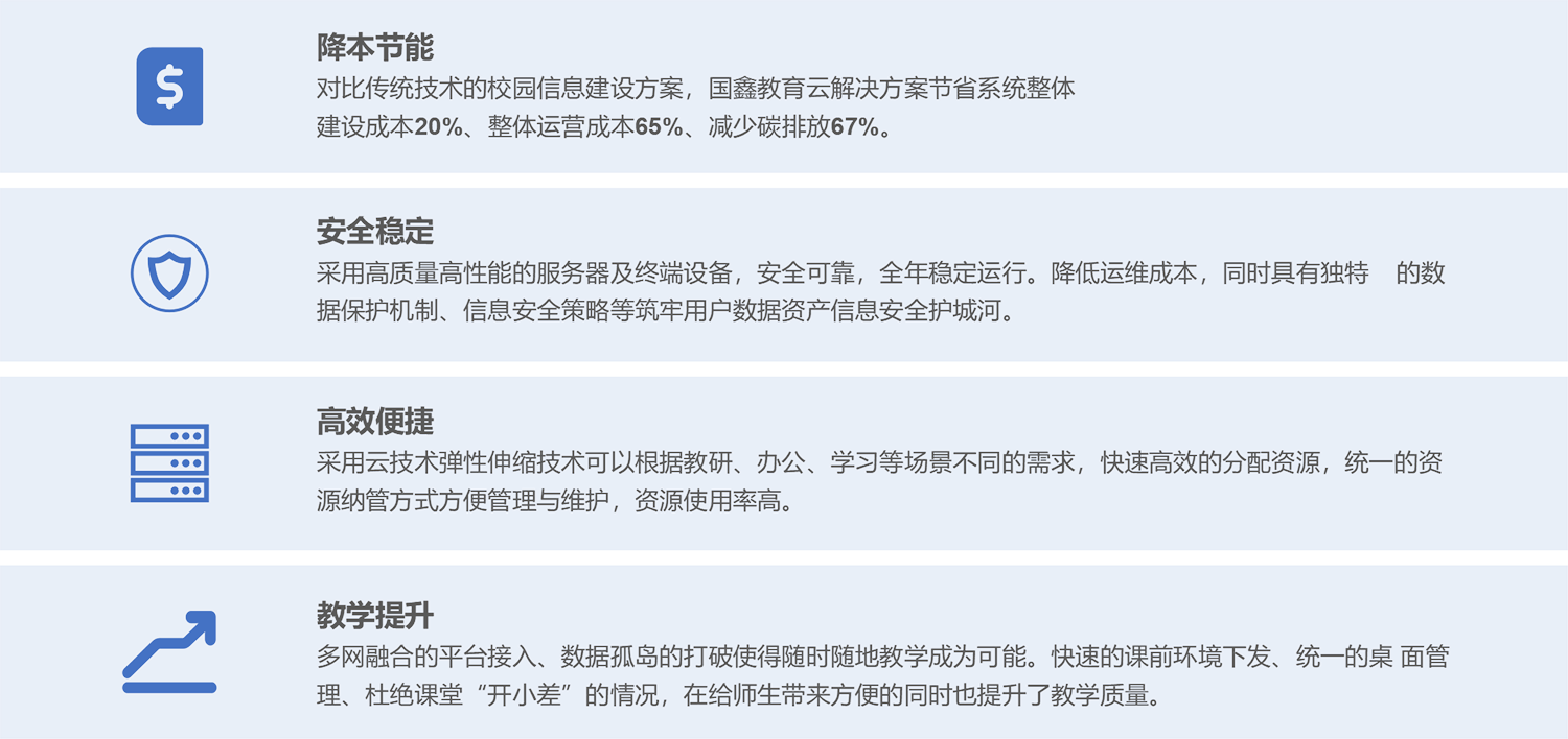 BWIN必赢国际教育云解决方案是针对教育业现状及遵循政策指导方向,采用自研国产硬件及自研软件平台,推出的教育行业云平台方案。方案基于云计算技术、互联网+战略格局、契合融合创新的思路,助力校园智慧建设,更好地为教育改革和开展给予信息化基础环境支撑。